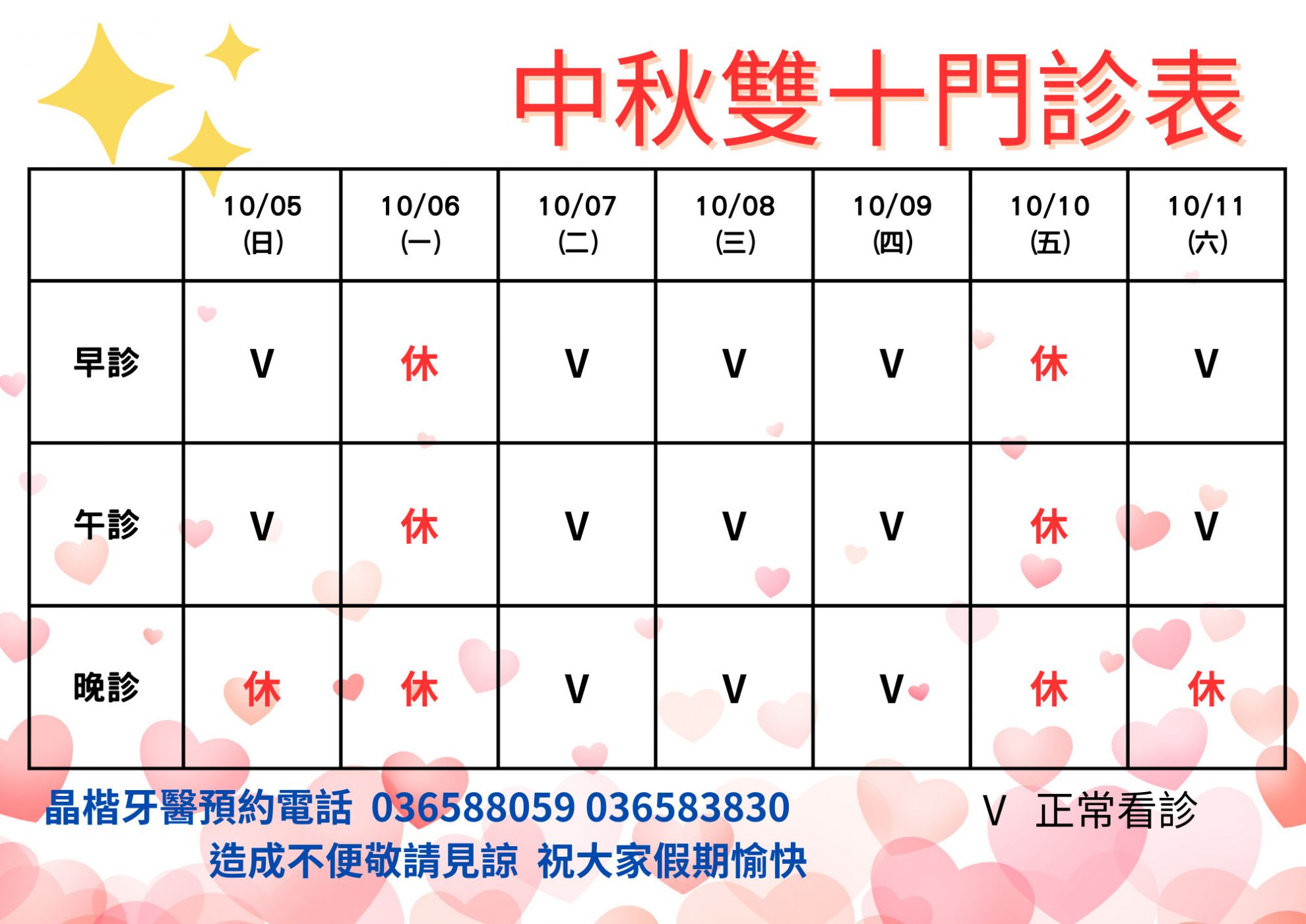 🔔中秋節連假公告 🔔親愛的患者您好:因應中秋節連續假期,本診所將於下列日期 休診,敬請提早安排就診時間:📅 休診日期:2025年10月6日(星期一) 📅 恢復看診:2025年10月7日(星期二)起恢復正常看診如有不便,敬請見諒。 祝福您與家人 中秋佳節愉快、月圓人團圓!感謝您的配合與支持!晶楷牙醫診所 敬上 分享到